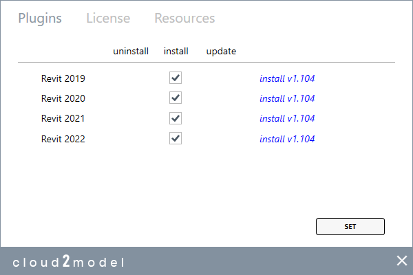 Forget IT hassle or licenses issues with the cloud2model manager. Install and update in all your different Revit versions with one click. And use your license in any computer with internet connection.