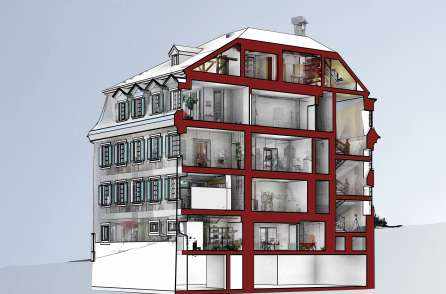 Die bestehenden Gebäude an der Strehlgasse 11 &13 in Schwyz wurden mit Laserscanning aufgenommen. Aus der daraus resultierenden Punktwolke wurde ein Revit-Modell erstellt. Dieses Modell wurde exportiert, um es danach in Archicad zu importieren. Die Abgabe erfolgte in einem Archicad-Format.