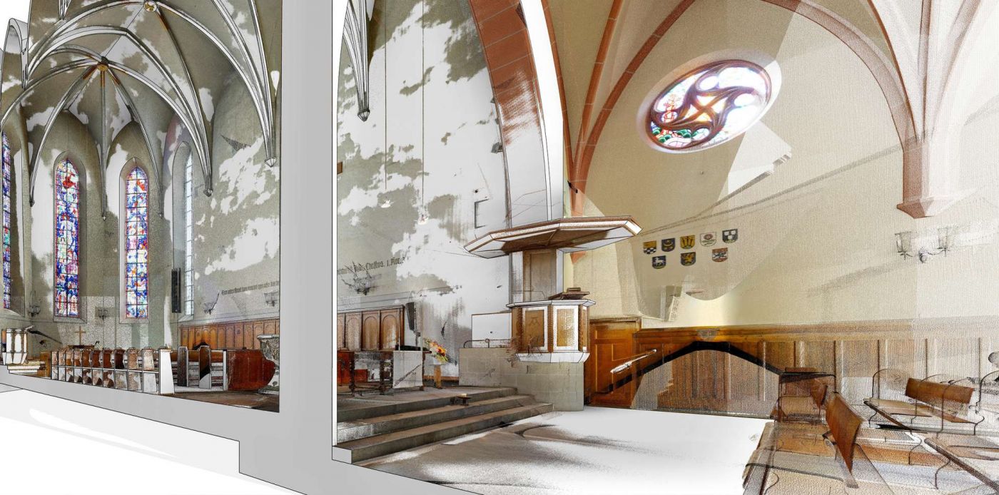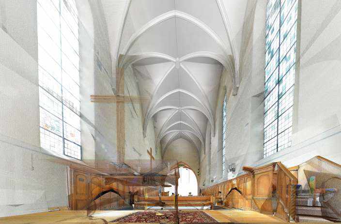Die BIM Facility AG hat das Team der Ateliermarti Architekten AG dabei unterstützt, Grundlagedaten für eine Renovation zu erstellen. Die Kirche wurde zuerst 3D gescannt und anschliessend nachmodelliert. Diese Methode vereinfachte den Prozess der Gebäudeaufnahme um ein Vielfaches. Die komplexen Formen der Kirche konventionell mittels 2D Plänen zu erfassen wäre teurer, aufwendiger und weniger zweckdienlich gewesen. Die spätere Nutzung dieser Grundlagenerfassung ermöglicht es auch, flexibel weitere Informationen oder Pläne aus dem 3D Modell automatisch generieren zu lassen.