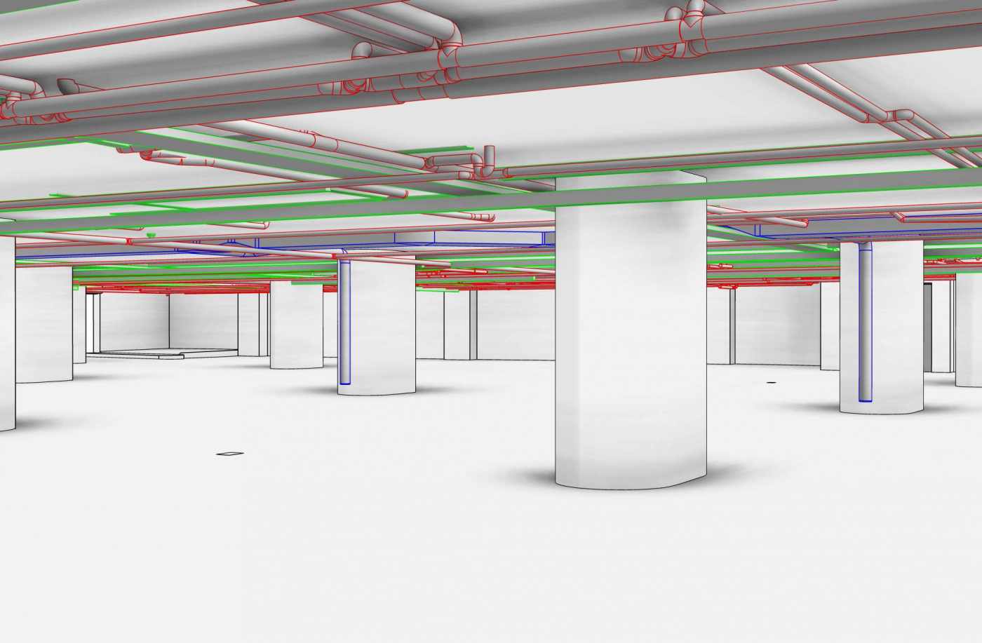 Als Planungsgrundlage für Sanierungsarbeiten des Parkhauses Tivoli in Spreitenbach sind vermessungstechnische Aufnahmen mittels Laserscanning sowie deren Modellierung vorgesehen. Unter anderem Wände, Stützen, Decken, Abläufe und Deckeninstallationen wurden erfasst und modelliert als geschlossene 3D-Bauelement mit ihrer Materialisierung. Aus dem Modell werden für den Kunden zusätzliche 2D-Pläne generiert.