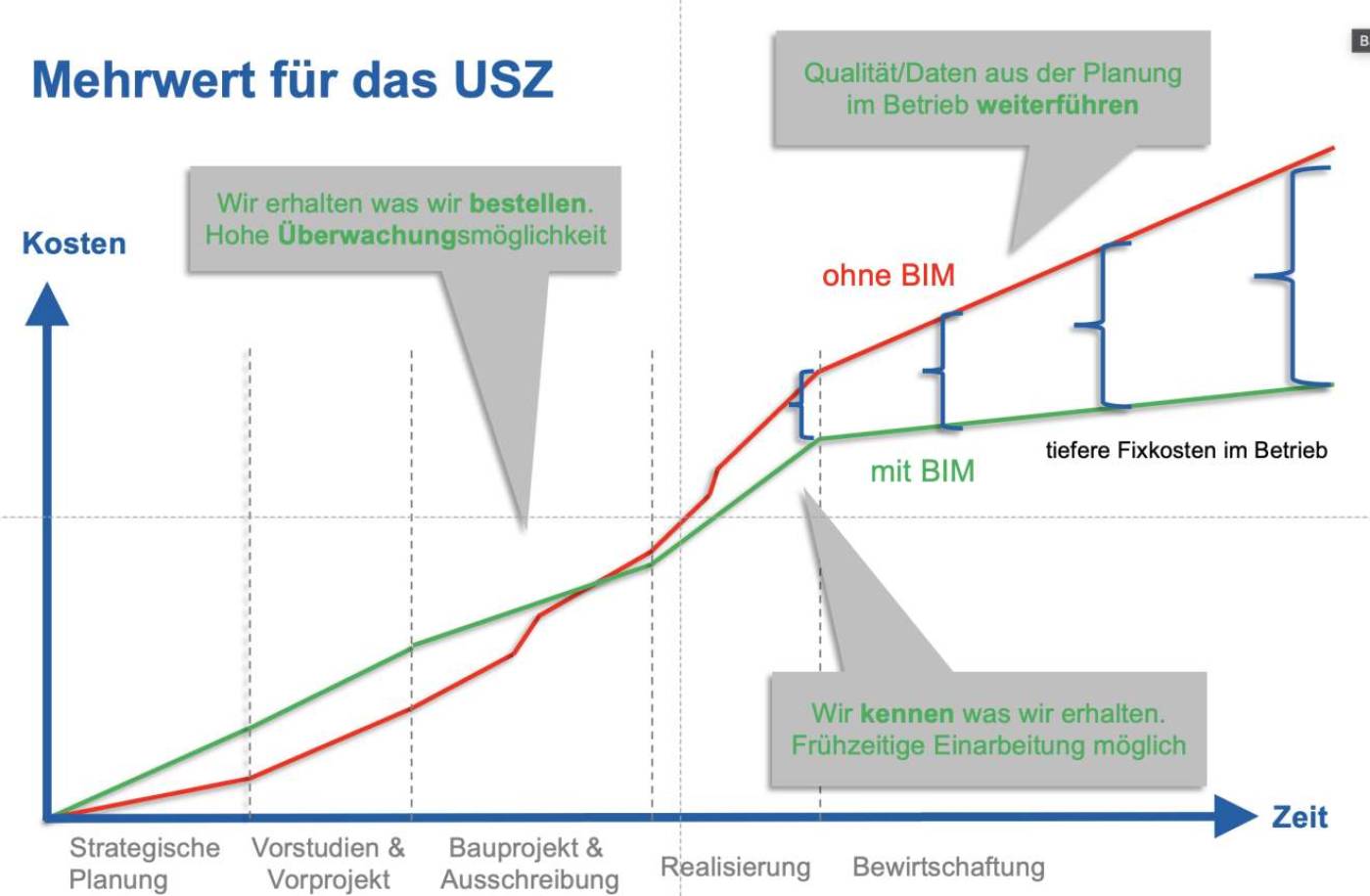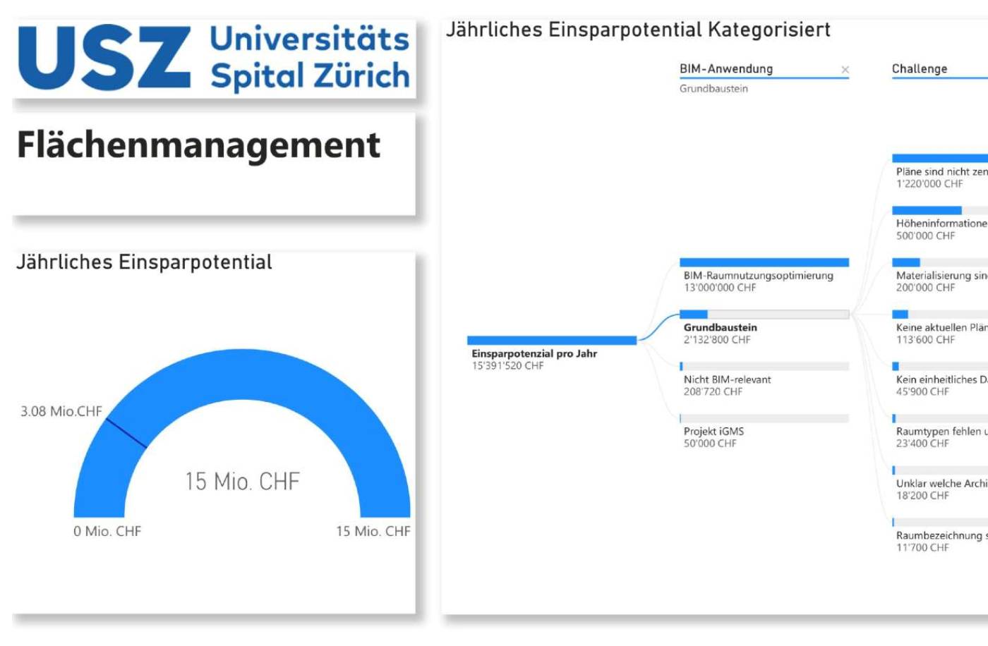 Im Rahmen des grossen und komplexen Neubauprojekts MITTE1/2 des USZ wurde eine BIM4FM-Strategie in der Direktion Betrieb verankert. Daraus und insbesondere basierend auf den täglichen Herausforderungen des Betriebs, wurde ROI von diversen Geschäftsfällen errechnet, welche BIM und ein aktueller digitaler Zwilling generieren wird. Daraus wurde ein digitales Liegenschafts-Informationsmodell definiert, um die Bewirtschaftung der USZ Gebäude auf die neue digitale Umgebung auszurichten.